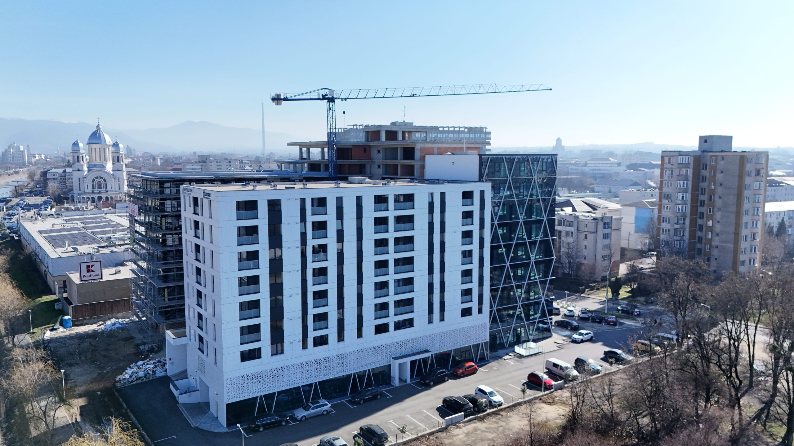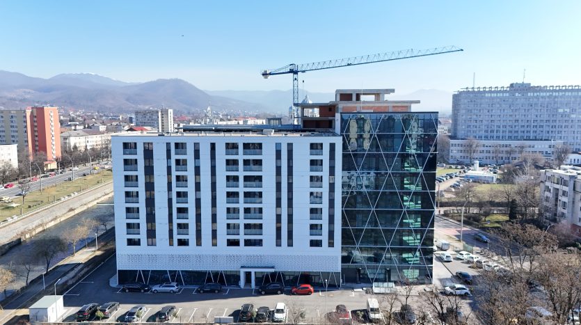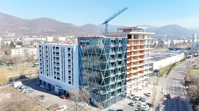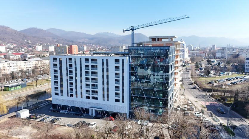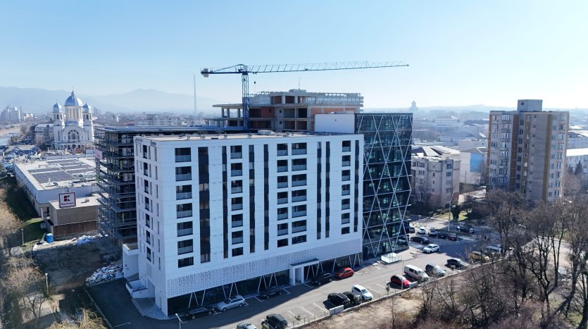 – fațadă modernă din sticlă, de tip cortină, cu izolație termică și fonică avansată, protecție superioară împotriva intemperiilor, deschideri batante și un coeficient UV ridicat, totul integrat într-un design contemporan impresionant.